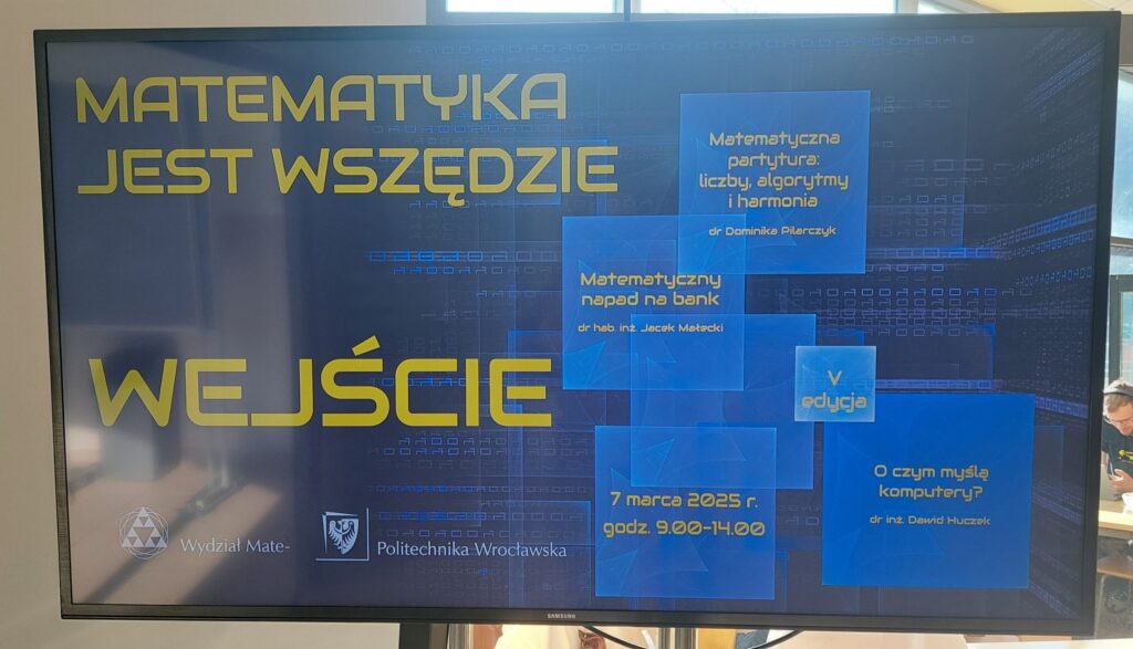 7 marca 2025 r. klasy 2b oraz 3b uczestniczyły w wykładach z cyklu „Matematyka Jest Wszędzie” zorganizowanych przez Wydział Matematyki Politechniki Wrocławskiej z okazji Międzynarodowego Dnia Matematyki. Zostały wygłoszone trzy wykłady. Pierwszy poprowadził dr hab. inż. Jacek Małecki -Matematyczny napad na bank, drugi dr Dominika Pilarczyk – Matematyczna partytura: liczby, algorytmy i harmonia, a trzeci dr inż. Dawid Huczek – O czym myślą komputery? Było to pełne wrażeń spotkanie z matematyką.